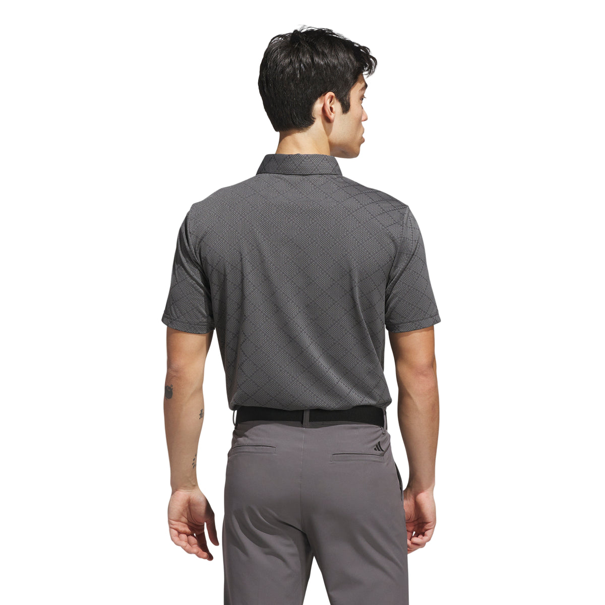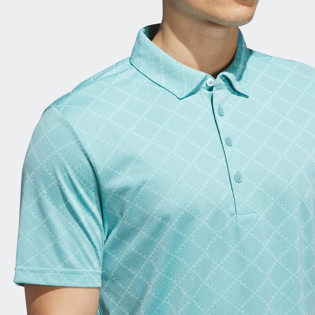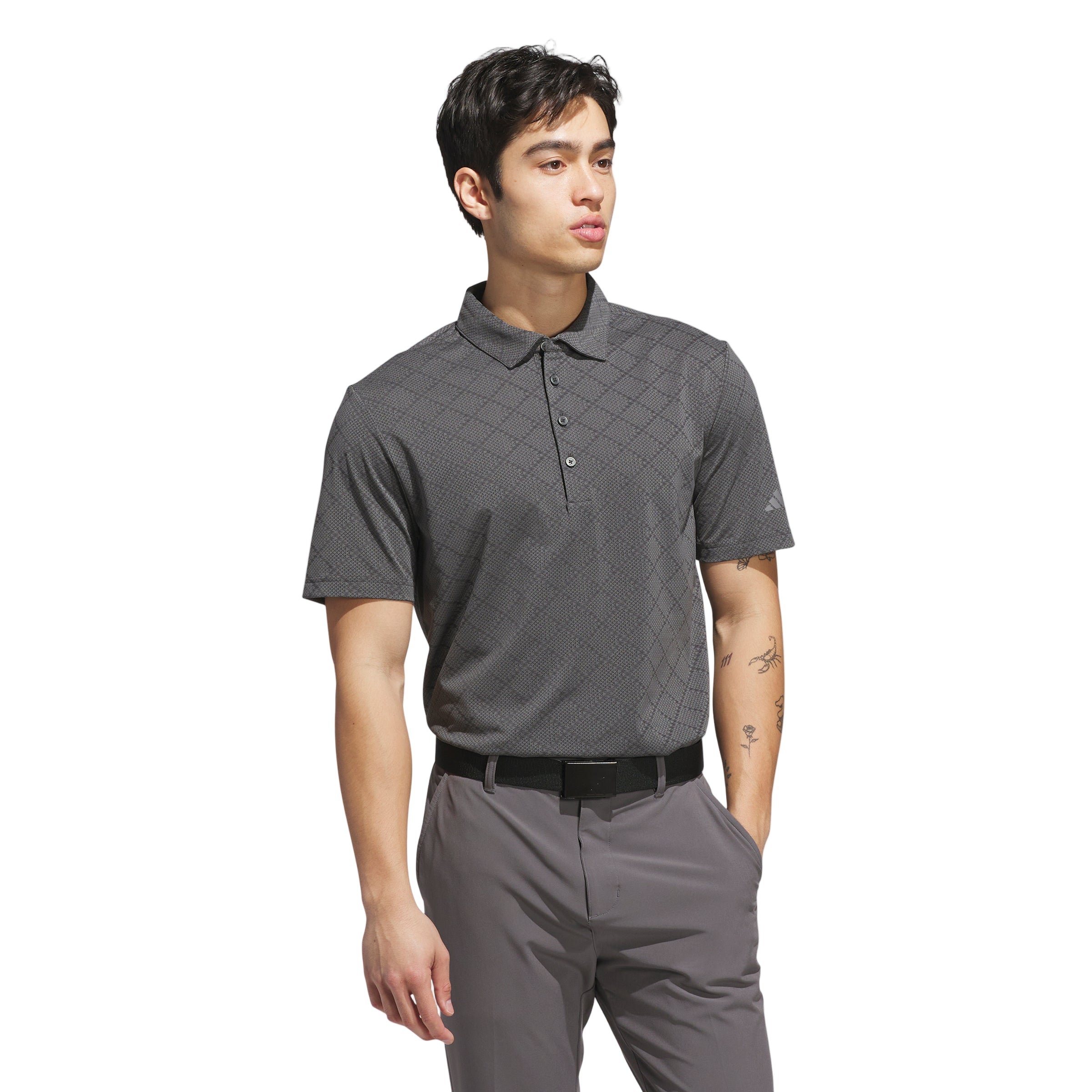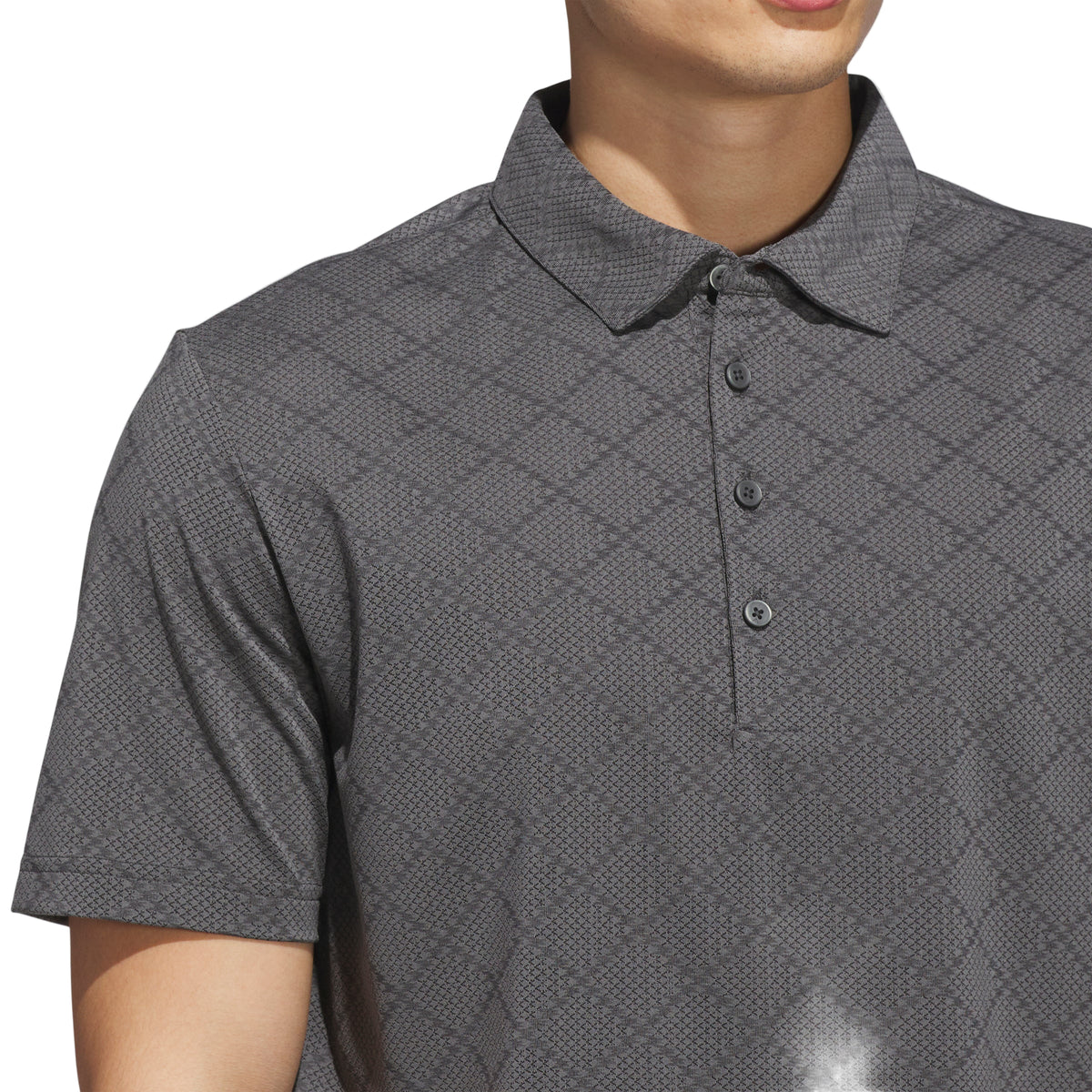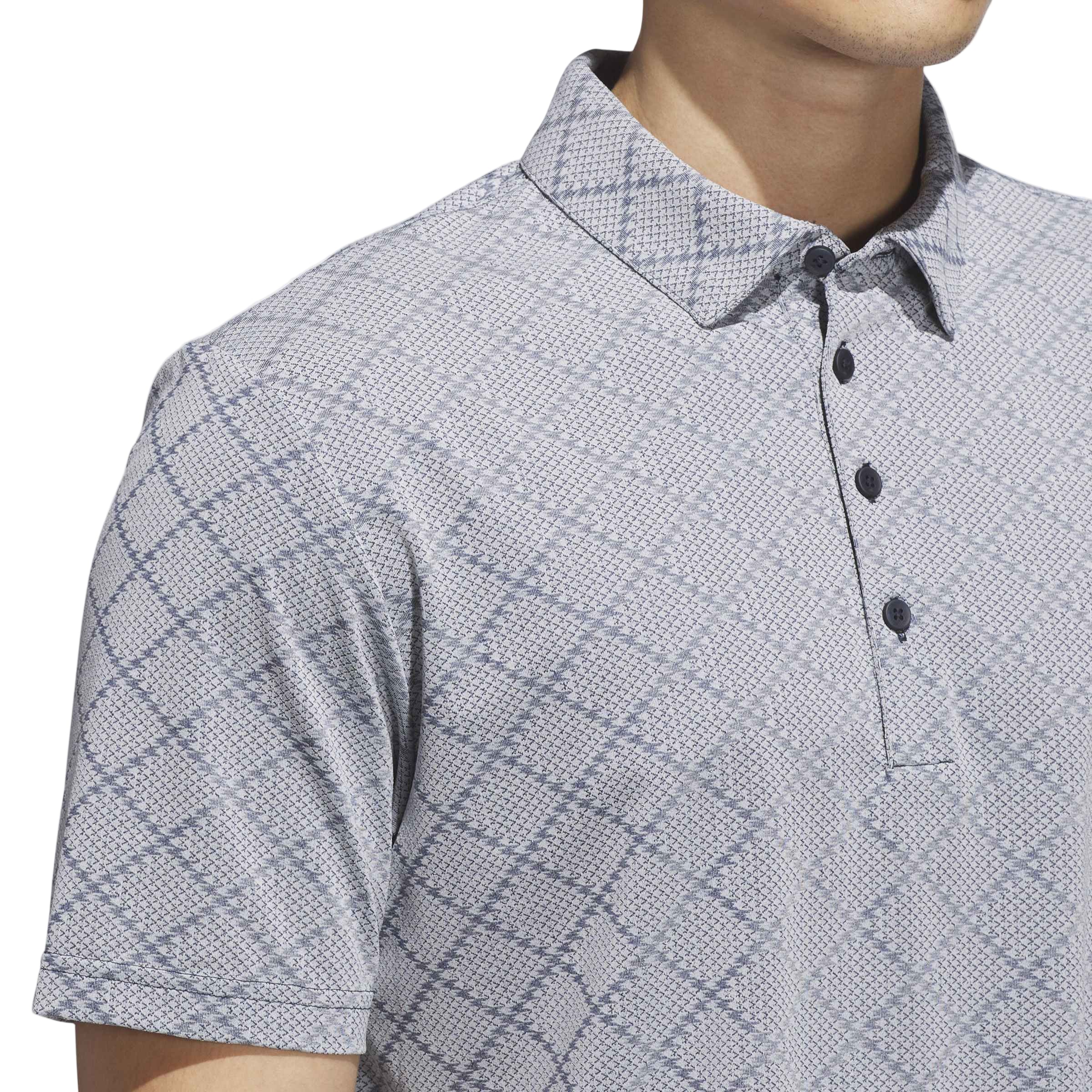 This adidas golf polo shirt stands out with a subtle houndstooth pattern that adds texture to a traditional course look. A regular fit and built-in stretch offer mobility and comfort for powerful drives and smooth putts.