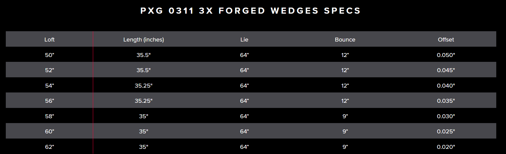 With a flawless body design, PXG 0311 Forged Wedges offer beauty and brains. Innovative technologies like Full Face Grooves and High Toe Weighting, work in tandem with a versatile sole design to perform a variety of shots from virtually any turf condition.