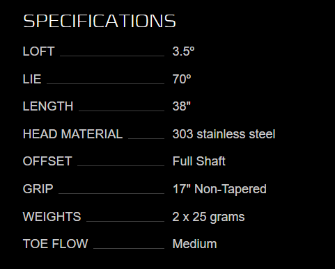 With an integrated 6061 aluminum sole plate that allows for higher MOI with more weight in the perimeter, the heavier head precision milled from 303 stainless steel includes two 25-gram tungsten sole weights and is counterbalanced by a custom-designed 17-inch, 136-gram pistol-style grip perfectly matched to the longer, stiffer shaft